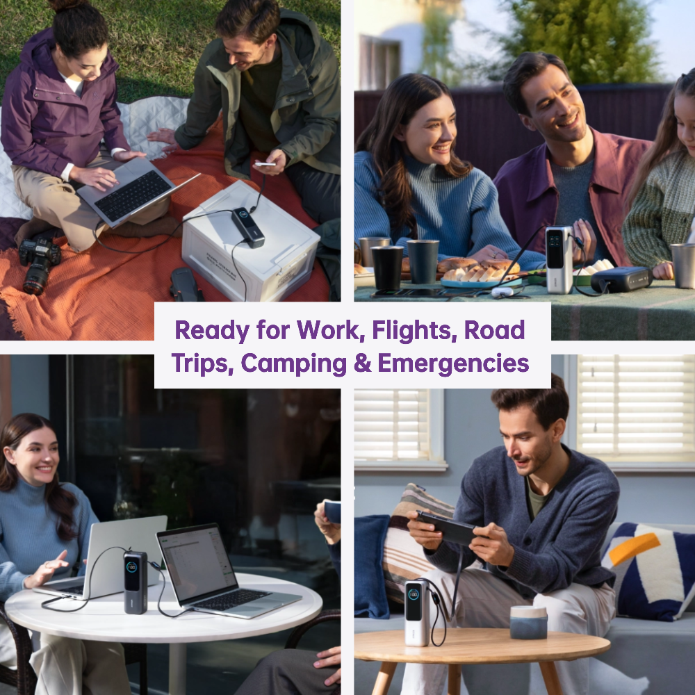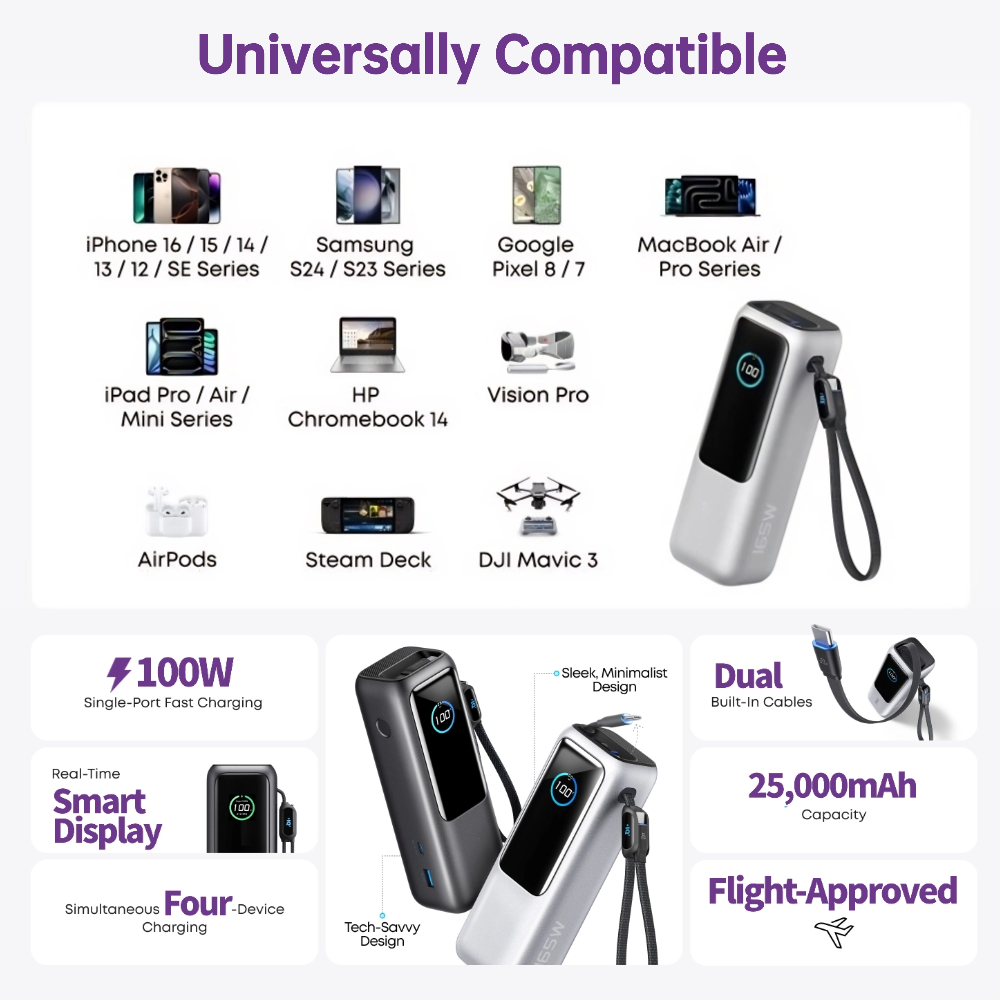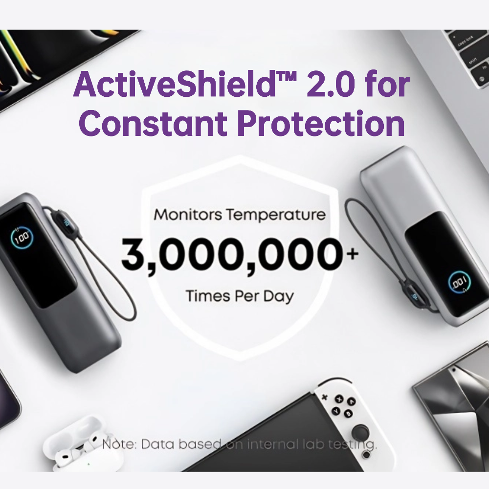 With ActiveShield™ 2.0, the 25,000mAh Laptop Power Bank continuously monitors temperature over 3,000,000 times a day to ensure safe, stable charging for all your devices—MacBook, iPhone 16/15, Samsung, and more. Triple 100W USB-C ports and built-in retractable cables deliver effortless, high-speed power wherever you go. Flight-approved and designed for modern travelers, it keeps you protected and powered—anytime, anywhere.